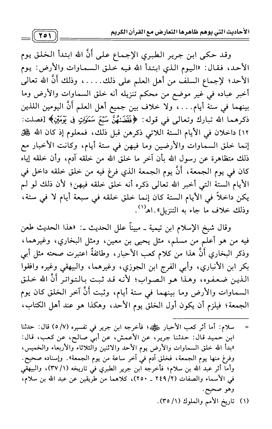 وقال شيخ الإسلام ابن تيمية - مبيناً علل الحديث -: "هذا الحديث طعن فيه من هو أعلم من مسلم، مثل يحيى بن معين، ومثل البخاري، وغيرهما، وذكر البخاري أَنَّ هذا من كلام كعب الأحبار، وطائفةٌ اعتبرت صحته مثل أبي بكر ابن الأنباري (¬2)، وأبي الفرج ابن الجوزي، وغيرهما، والبيهقي وغيره وافقوا الذين ضعفوه، وهذا هو الصواب; لأنه قد ثبت بالتواتر أَنَّ الله خلق السماوات والأرض وما بينهما في ستة أيام، وثبت أَنَّ آخر الخلق كان يوم الجمعة؛ فيلزم أن يكون أول الخلق يوم الأحد، وهكذا هو عند أهل الكتاب،