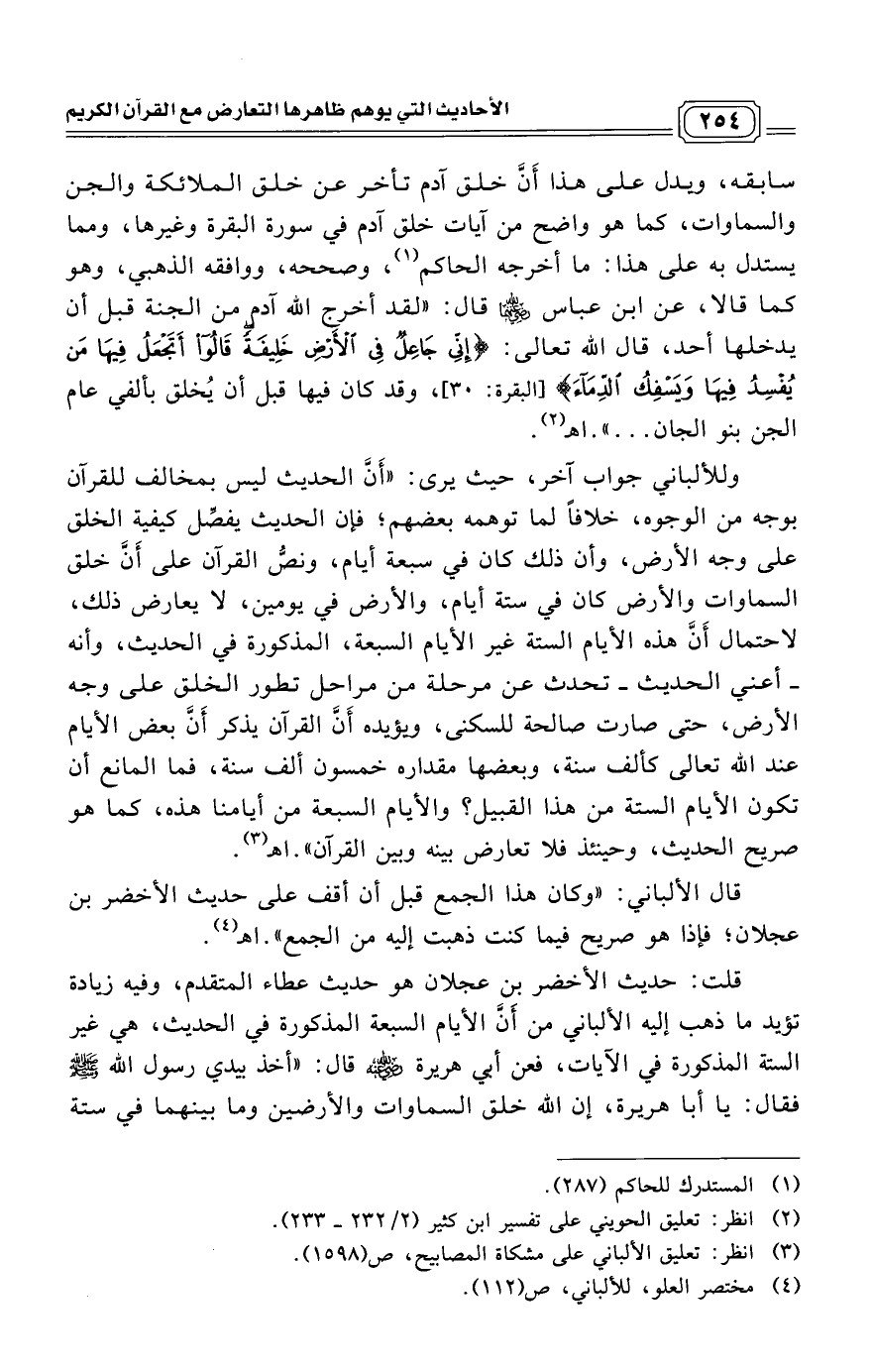 وللألباني جواب آخر، حيث يرى: "أَنَّ الحديث ليس بمخالف للقرآن بوجه من الوجوه، خلافاً لما توهمه بعضهم؛ فإن الحديث يفصِّل كيفية الخلق على وجه الأرض، وأن ذلك كان في سبعة أيام، ونصُّ القرآن على أَنَّ خلق السماوات والأرض كان في ستة أيام، والأرض في يومين، لا يعارض ذلك، لاحتمال أَنَّ هذه الأيام الستة غير الأيام السبعة، المذكورة في الحديث، وأنه - أعني الحديث - تحدث عن مرحلة من مراحل تطور الخلق على وجه الأرض، حتى صارت صالحة للسكنى، ويؤيده أَنَّ القرآن يذكر أَنَّ بعض الأيام عند الله تعالى كألف سنة، وبعضها مقداره خمسون ألف سنة، فما المانع أن تكون الأيام الستة من هذا القبيل؟ والأيام السبعة من أيامنا هذه، كما هو صريح الحديث، وحينئذ فلا تعارض بينه وبين القرآن". اهـ (¬3)