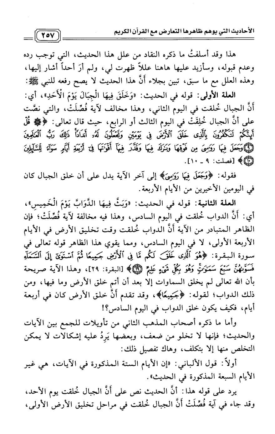 العلة الثانية: قوله في الحديث: "وَبَثَّ فِيهَا الدَّوَابَّ يَوْمَ الْخَمِيسِ"، أي أَنَّ الدواب خُلقت في اليوم السادس، وهذا فيه مخالفة لآية فُصِّلَتْ؛ فإن الظاهر المتبادر من الآية أَنَّ الدواب خُلقت وقت تخليق الأرض في الأيام الأربعة الأولى، لا في اليوم السادس، ومما يقوي هذا الظاهر قوله تعالى في سورة البقرة: (هُوَ الَّذِي خَلَقَ لَكُمْ مَا فِي الْأَرْضِ جَمِيعًا ثُمَّ اسْتَوَى إِلَى السَّمَاءِ فَسَوَّاهُنَّ سَبْعَ سَمَاوَاتٍ وَهُوَ بِكُلِّ شَيْءٍ عَلِيمٌ (29)) [البقرة: 29]، وهذا الآية صريحة بأن الله تعالى لم يخلق السماوات إلا بعد أن أتم خلق الأرض وما فيها، ومن ذلك الدواب؛ لقوله: (جَمِيعًا)، وقد تقدم أَنَّ خلق الأرض كان في أربعة أيام، فكيف يكون خلق الدواب في اليوم السادس؟!