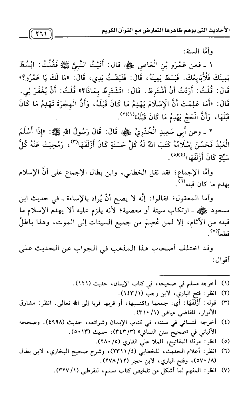 1 - فعن عَمْرَو بْنِ الْعَاصِ - رضي الله عنه - قال: أَتَيْتُ النَّبِيَّ - صلى الله عليه وسلم - فَقُلْتُ: ابْسُطْ يَمِينَكَ فَلْأُبَايِعْكَ. فَبَسَطَ يَمِينَهُ، قَالَ: فَقَبَضْتُ يَدِي، قَالَ: "مَا لَكَ يَا عَمْرُو؟ " قَالَ: قُلْتُ: أَرَدْتُ أَنْ أَشْتَرِطَ. قَالَ: "تَشْتَرِطُ بِمَاذَا؟ " قُلْتُ: أَنْ يُغْفَرَ لِي. قَالَ: "أَمَا عَلِمْتَ أَنَّ الْإِسْلَامَ يَهْدِمُ مَا كَانَ قَبْلَهُ، وَأَنَّ الْهِجْرَةَ تَهْدِمُ مَا كَانَ قَبْلَهَا، وَأَنَّ الْحَجَّ يَهْدِمُ مَا كَانَ قَبْلَهُ". (¬1) (¬2)