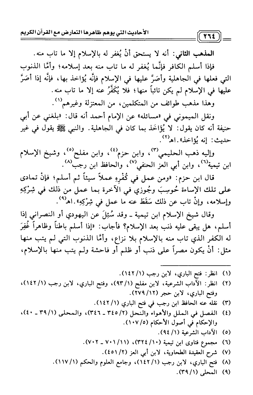 ونقل الميموني (¬2) في "مسائله" عن الإمام أحمد أنه قال: "بلغني عن أبي حنيفة أنه كان يقول: لا يُؤَاخَذ بما كان في الجاهلية. والنبي - صلى الله عليه وسلم - يقول في غير حديث: إنه يُؤاخذ". اهـ (¬3) وإليه ذهب الحليمي (¬4)، وابن حزم (¬5)، وابن مفلح (¬6)، وشيخ الإسلام ابن تيمية (¬7)، وابن أبي العز الحنفي (¬8)، والحافظ ابن رجب (¬9).