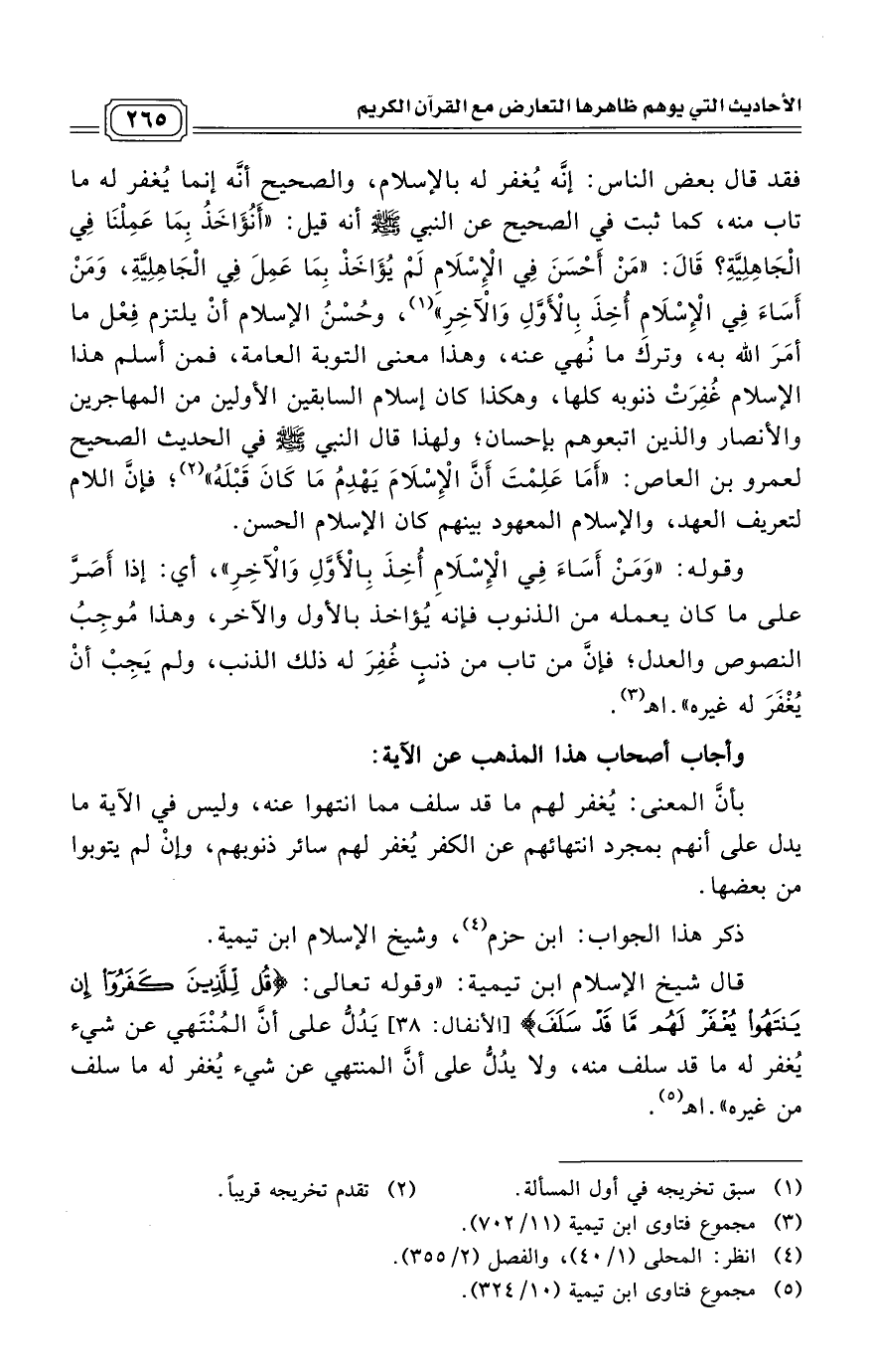 قال شيخ الإسلام ابن تيمية: "وقوله تعالى: (قُلْ لِلَّذِينَ كَفَرُوا إِنْ يَنْتَهُوا يُغْفَرْ لَهُمْ مَا قَدْ سَلَفَ) [الأنفال: 38] يَدُلُّ على أنَّ المُنْتَهي عن شيء يُغفر له ما قد سلف منه، ولا يدُلُّ على أنَّ المنتهي عن شيء يُغفر له ما سلف من غيره". اهـ (¬5)