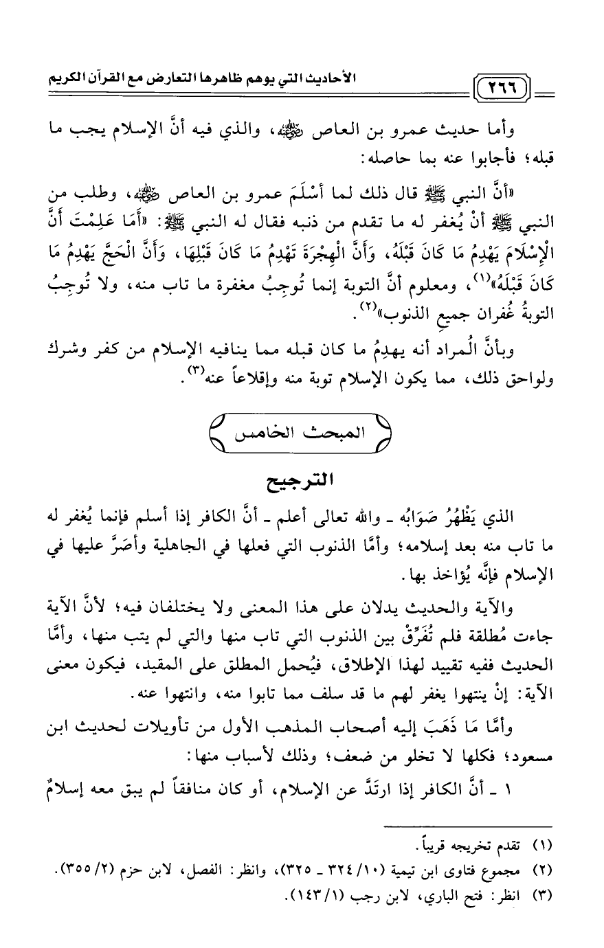 وبأنَّ الُمراد أنه يهدِمُ ما كان قبله مما ينافيه الإسلام من كفر وشرك ولواحق ذلك، مما يكون الإسلام توبة منه وإقلاعاً عنه. (¬3)