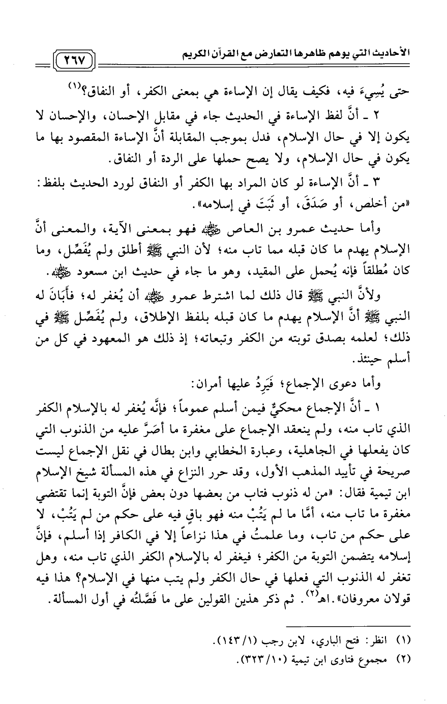 1 - أنَّ الإجماع محكيٌّ فيمن أسلم عموماً؛ فإنَّه يُغفر له بالإسلام الكفر الذي تاب منه، ولم ينعقد الإجماع على مغفرة ما أصَرَّ عليه من الذنوب التي كان يفعلها في الجاهلية، وعبارة الخطابي وابن بطال في نقل الإجماع ليست صريحة في تأييد المذهب الأول، وقد حرر النزاع في هذه المسألة شيخ الإسلام ابن تيمية فقال: "من له ذنوب فتاب من بعضها دون بعض فإنَّ التوبة إنما تقتضي مغفرة ما تاب منه، أمَّا ما لم يَتُبْ منه فهو باقٍ فيه على حكم من لم يَتُبْ، لا على حكم من تاب، وما علمتُ في هذا نزاعاً إلا في الكافر إذا أسلم، فإنَّ إسلامه يتضمن التوبة من الكفر؛ فيغفر له بالإسلام الكفر الذي تاب منه، وهل تغفر له الذنوب التي فعلها في حال الكفر ولم يتب منها في الإسلام؟ هذا فيه قولان معروفان". اهـ (¬2) ثم ذكر هذين القولين على ما فَصَّلتُه في أول المسألة.
