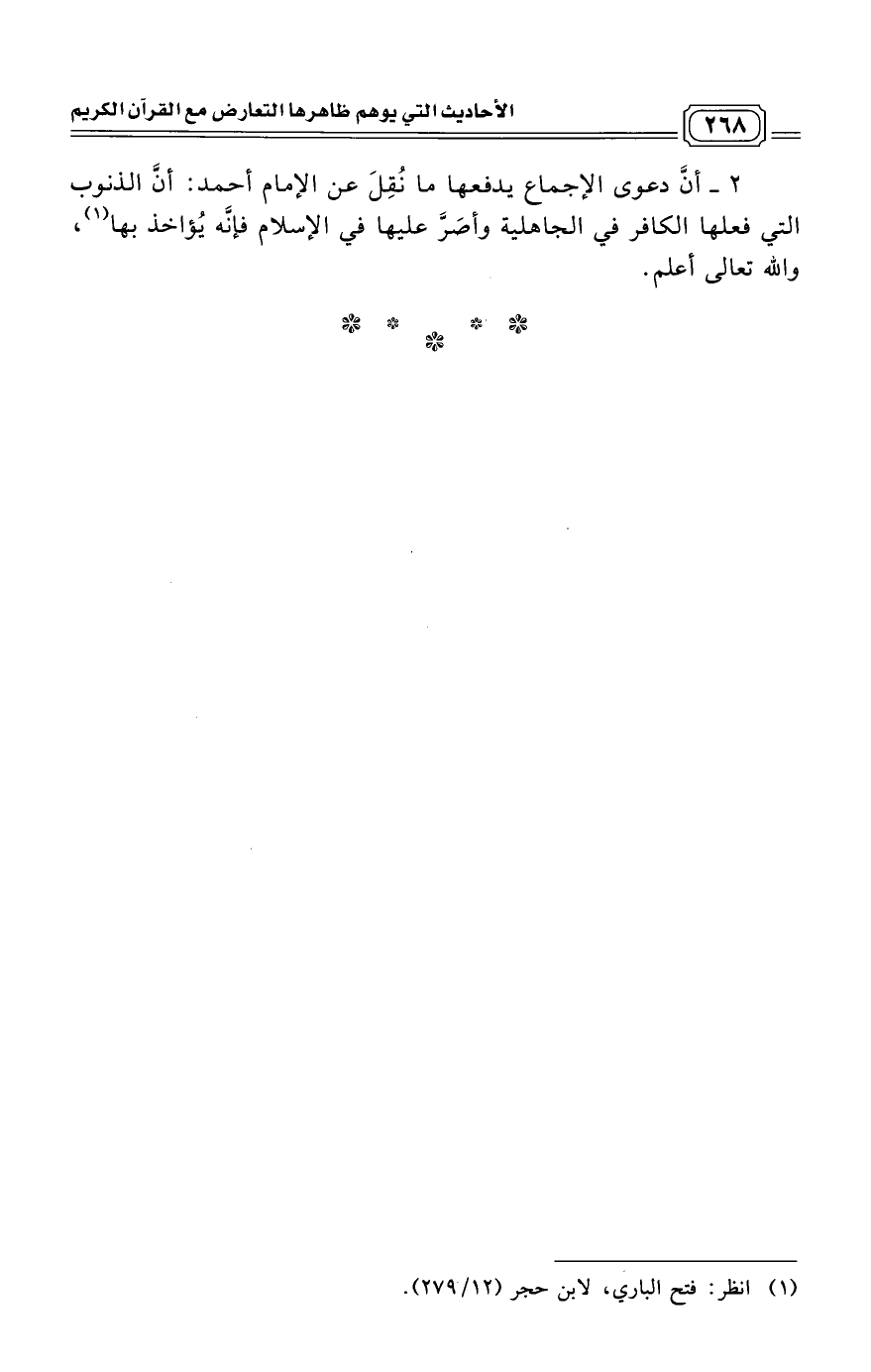 2 - أنَّ دعوى الإجماع يدفعها ما نُقِلَ عن الإمام أحمد: أنَّ الذنوب التي فعلها الكافر في الجاهلية وأصَرَّ عليها في الإسلام فإنَّه يُؤاخذ بها (¬1)، والله تعالى أعلم.