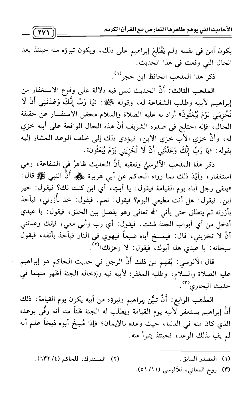 ذكر هذا المذهب الآلوسيُّ وتعقبه بأنَّ الحديث ظاهرٌ في الشفاعة، وهي استغفار، وأيّدَ ذلك بما رواه الحاكم عن أبي هريرة - رضي الله عنه - أَنَّ النبي - صلى الله عليه وسلم - قال: "يلقى رجل أباه يوم القيامة فيقول: يا أبتِ، أي ابن كنت لك؟ فيقول: خير ابن. فيقول: هل أنت مطيعي اليوم؟ فيقول: نعم. فيقول: خذ بأُزرتي، فيأخذ بأزرته ثم ينطلق حتى يأتي الله تعالى وهو يفصل بين الخلق، فيقول: يا عبدي أدخل من أي أبواب الجنة شئت. فيقول: أي رب وأبي معي، فإنك وعدتني أنْ لا تخزيني، قال: فيمسخ أباه ضبعاً فيهوي في النار فيأخذ بأنفه فيقول سبحانه: يا عبدي هذا أبوك، فيقول: لا وعزتك". (¬2)