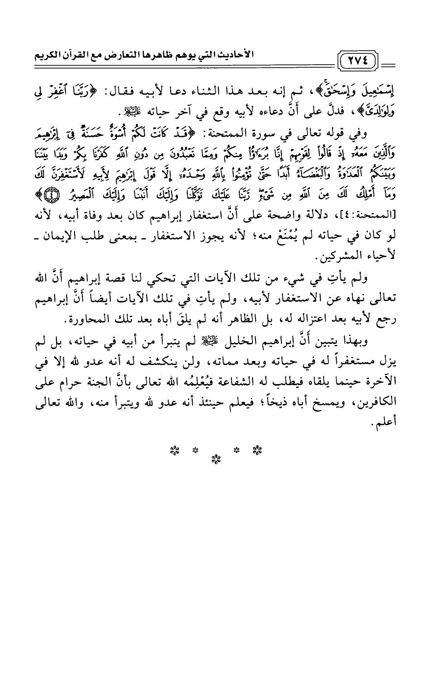 وفي قوله تعالى في سورة الممتحنة: (قَدْ كَانَتْ لَكُمْ أُسْوَةٌ حَسَنَةٌ فِي إِبْرَاهِيمَ وَالَّذِينَ مَعَهُ إِذْ قَالُوا لِقَوْمِهِمْ إِنَّا بُرَآءُ مِنْكُمْ وَمِمَّا تَعْبُدُونَ مِنْ دُونِ اللَّهِ كَفَرْنَا بِكُمْ وَبَدَا بَيْنَنَا وَبَيْنَكُمُ الْعَدَاوَةُ وَالْبَغْضَاءُ أَبَدًا حَتَّى تُؤْمِنُوا بِاللَّهِ وَحْدَهُ إِلَّا قَوْلَ إِبْرَاهِيمَ لِأَبِيهِ لَأَسْتَغْفِرَنَّ لَكَ وَمَا أَمْلِكُ لَكَ مِنَ اللَّهِ مِنْ شَيْءٍ رَبَّنَا عَلَيْكَ تَوَكَّلْنَا وَإِلَيْكَ أَنَبْنَا وَإِلَيْكَ الْمَصِيرُ (4)) [الممتحنة: 4]، دلالة واضحة على أَنَّ استغفار إبراهيم كان بعد وفاة أبيه، لأنه لو كان في حياته لم يُمْنَعْ منه؛ لأنه يجوز الاستغفار ـ بمعنى طلب الإيمان ـ لأحياء المشركين.