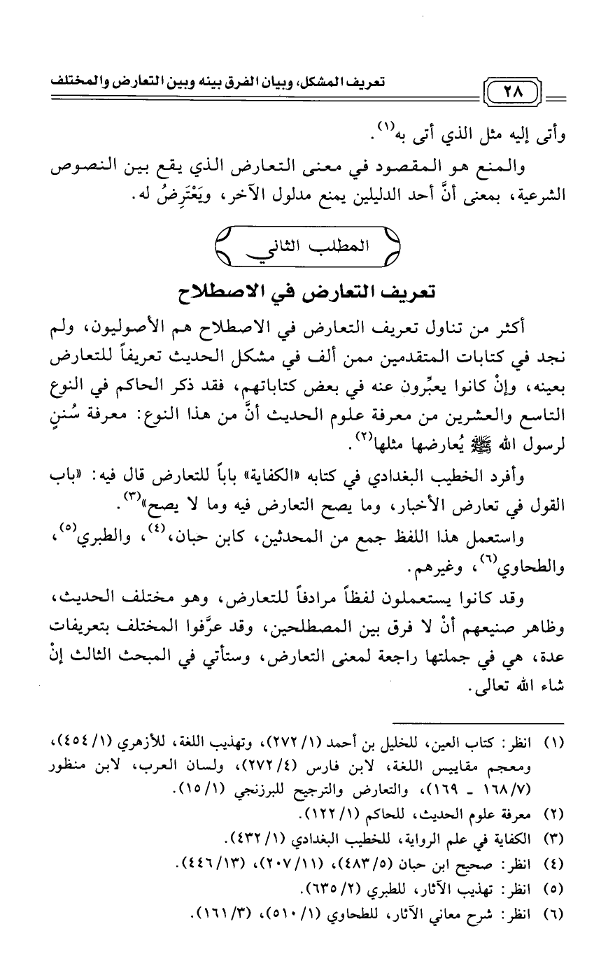 (¬1) انظر: كتاب العين، للخليل بن أحمد (1/ 272)، وتهذيب اللغة، للأزهري (1/ 454)، ومعجم مقاييس اللغة، لابن فارس (4/ 272)، ولسان العرب، لابن منظور (7/ 168 - 169)، والتعارض والترجيح للبرزنجي (1/ 15).