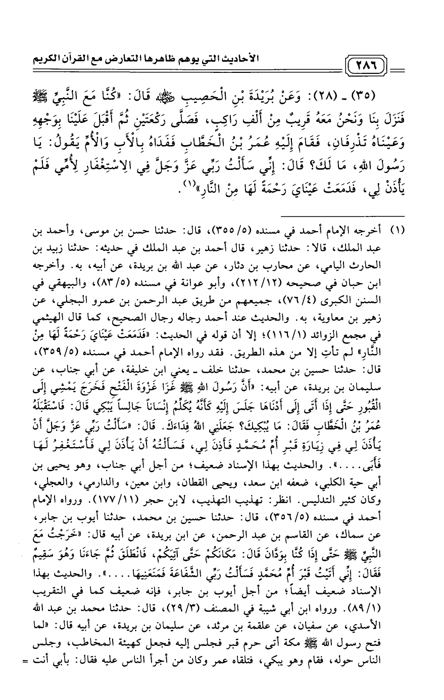 (35) ـ (28): وَعَنْ بُرَيْدَةَ بْنِ الْحَصِيبِ - رضي الله عنه - قَالَ: "كُنَّا مَعَ النَّبِيِّ صَلَّى اللَّهُ عَلَيْهِ وَسَلَّمَ، فَنَزَلَ بِنَا وَنَحْنُ مَعَهُ قَرِيبٌ مِنْ أَلْفِ رَاكِبٍ، فَصَلَّى رَكْعَتَيْنِ ثُمَّ أَقْبَلَ عَلَيْنَا بِوَجْهِهِ وَعَيْنَاهُ تَذْرِفَانِ، فَقَامَ إِلَيْهِ عُمَرُ بْنُ الْخَطَّابِ فَفَدَاهُ بِالْأَبِ وَالْأُمِّ يَقُولُ: يَا رَسُولَ اللَّهِ، مَا لَكَ؟ قَالَ: إِنِّي سَأَلْتُ رَبِّي عَزَّ وَجَلَّ فِي الِاسْتِغْفَارِ لِأُمِّي فَلَمْ يَأْذَنْ لِي، فَدَمَعَتْ عَيْنَايَ رَحْمَةً لَهَا مِنْ النَّارِ". (¬1)