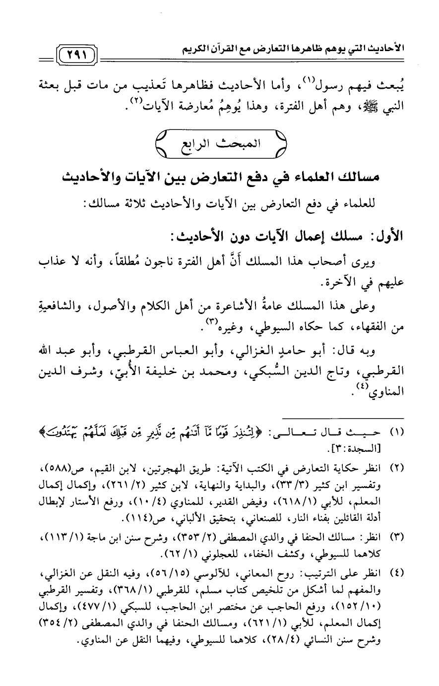المبحث الرابع: مسالك العلماء في دفع التعارض بين الآيات والأحاديث: