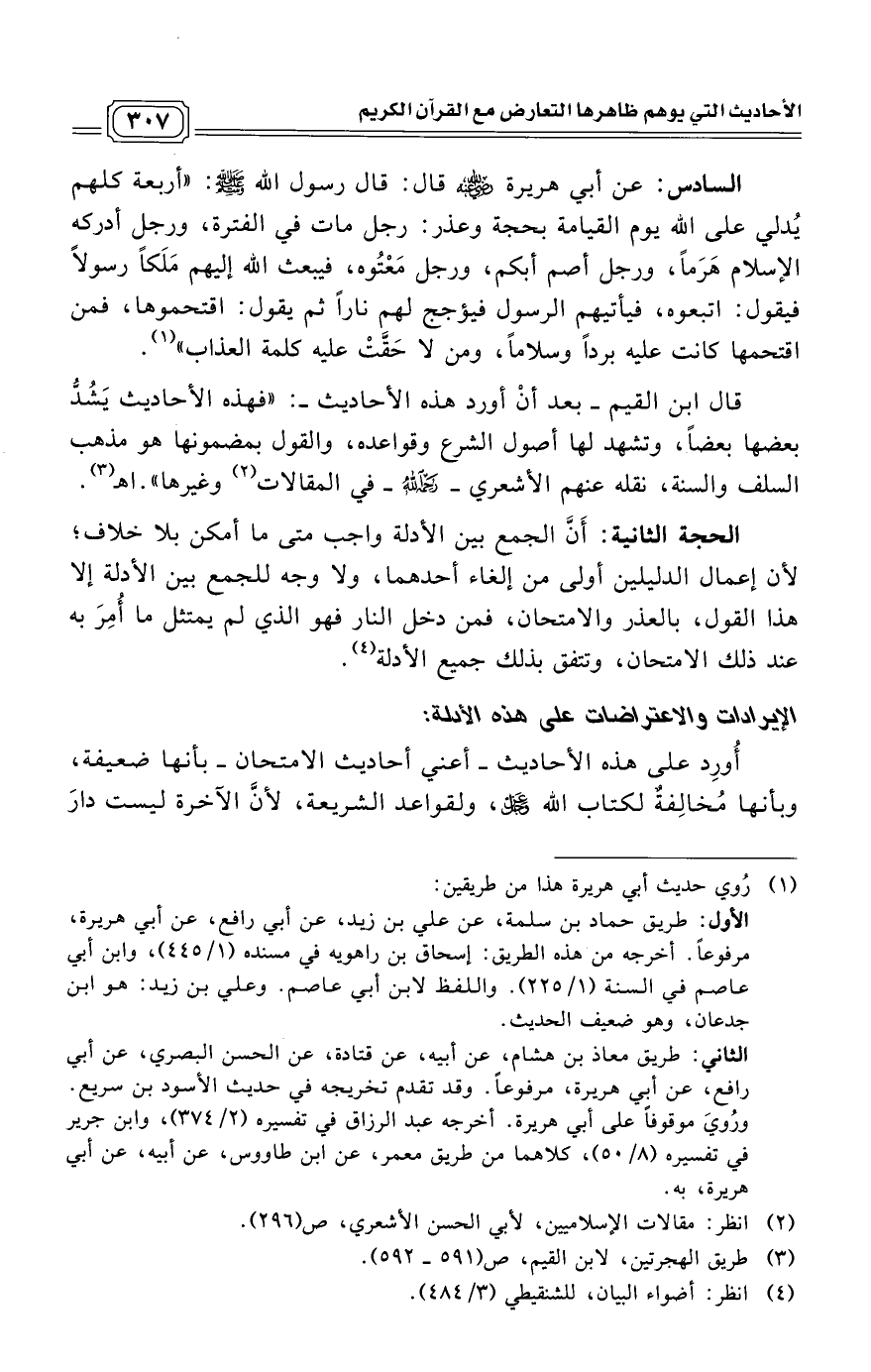 الحجة الثانية: أَنَّ الجمع بين الأدلة واجب متى ما أمكن بلا خلاف؛ لأن إعمال الدليلين أولى من إلغاء أحدهما، ولا وجه للجمع بين الأدلة إلا هذا القول، بالعذر والامتحان، فمن دخل النار فهو الذي لم يمتثل ما أُمِرَ به عند ذلك الامتحان، وتتفق بذلك جميع الأدلة. (¬4)