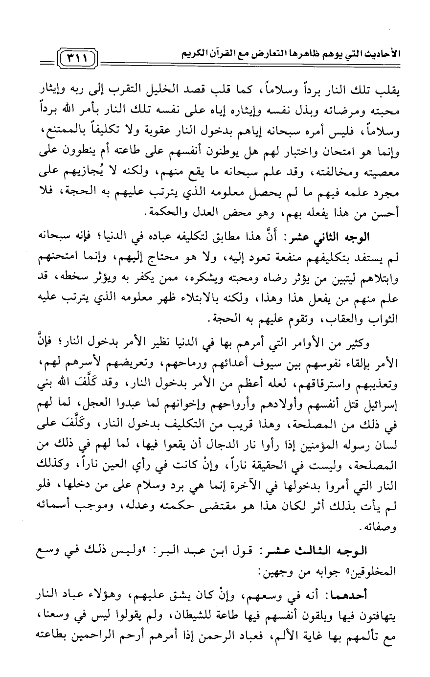 وكثير من الأوامر التي أمرهم بها في الدنيا نظير الأمر بدخول النار؛ فإنَّ الأمر بإلقاء نفوسهم بين سيوف أعدائهم ورماحهم، وتعريضهم لأسرهم لهم، وتعذيبهم واسترقاقهم، لعله أعظم من الأمر بدخول النار، وقد كَلَّفَ الله بني إسرائيل قتل أنفسهم وأولادهم وأرواحهم وإخوانهم لما عبدوا العجل، لما لهم في ذلك من المصلحة، وهذا قريب من التكليف بدخول النار، وكَلَّفَ على لسان رسوله المؤمنين إذا رأوا نار الدجال أن يقعوا فيها، لما لهم في ذلك من المصلحة، وليست في الحقيقة ناراً، وإنْ كانت في رأي العين ناراً، وكذلك النار التي أمروا بدخولها في الآخرة إنما هي برد وسلام على من دخلها، فلو لم يأت بذلك أثر لكان هذا هو مقتضى حكمته وعدله، وموجب أسمائه وصفاته.