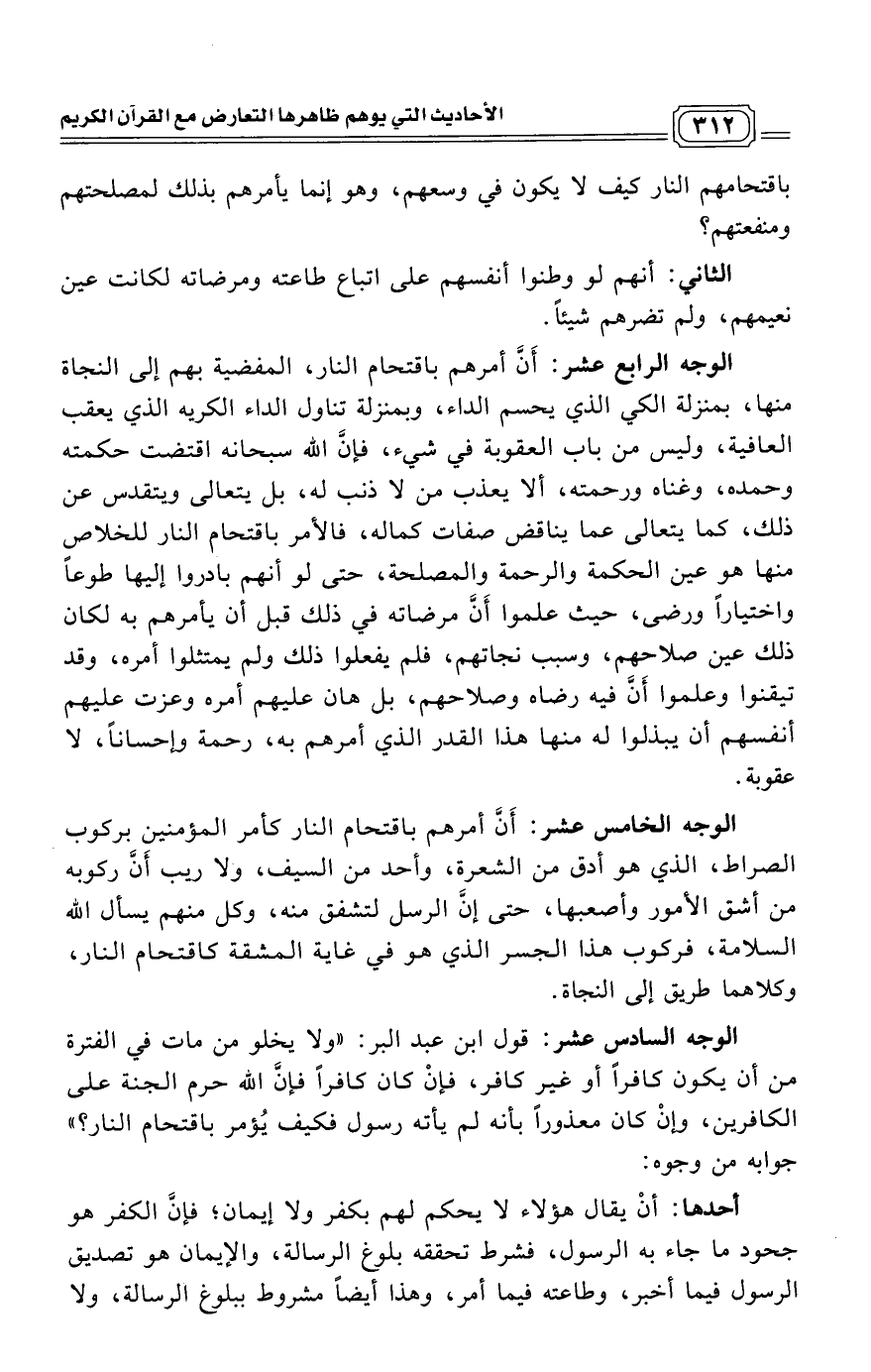 الوجه السادس عشر: قول ابن عبد البر: "ولا يخلو من مات في الفترة من أن يكون كافراً أو غير كافر، فإنْ كان كافراً فإنَّ الله حرم الجنة على الكافرين، وإنْ كان معذوراً بأنه لم يأته رسول فكيف يُؤمر باقتحام النار؟ " جوابه من وجوه: