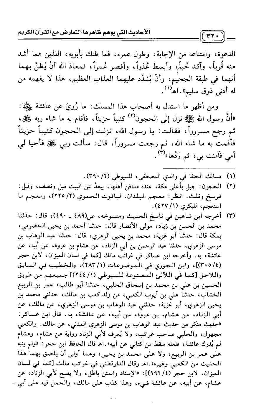 (¬3) أخرجه ابن شاهين في ناسخ الحديث ومنسوخه، ص (489 - 490)، قال: حدثنا محمد بن الحسن بن زياد، مولى الأنصار قال: حدثنا أحمد بن يحيى الحضرمي، بمكة قال: حدثنا أبو غزية، محمد بن يحيى الزهري، قال: حدثنا عبد الوهاب بن موسى الزهري، حدثنا عبد الرحمن بن أبي الزناد، عن هشام بن عروة، عن أبيه، عن عائشة، به.