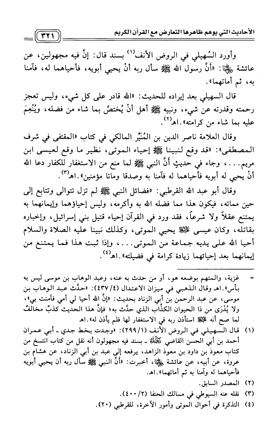 (¬1) قال السهيلي في الروض الأنف (1/ 299): "وجدت بخط جدي - أبي عمران أحمد بن أبي الحسن القاضي رحمه الله - بسند فيه مجهولون أنه نقل من كتاب انتسخ من كتاب معوذ بن داود بن معوذ الزاهد، يرفعه إلى عبد بن أبي الزناد، عن هشام بن عروة، عن أبيه، عن عائشة رضي الله عنها، أخبرت: "أَنَّ النبي - صلى الله عليه وسلم - سأل ربه أن يحيي أبويه فأحياهما له وآمنا به ثم أماتهما". اهـ