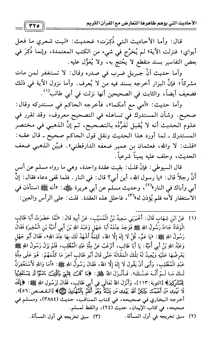 قال السيوطي: فإنْ قلتَ: بقيت عقدة واحدة، وهي ما رواه مسلم عن أنس أَنَّ رجلاً قال: "يا رسول الله، أين أبي؟ قال: في النار. فلما قفى دعاه فقال: إنَّ أبي وأباك في النار" (¬2)، وحديث مسلم عن أبي هريرة - رضي الله عنه -: "أنه - صلى الله عليه وسلم - استأذن في الاستغفار لأمه فلم يُؤذن له" (¬3)، فاحلل هذه العقدة. قلت: على الرأس والعين:
