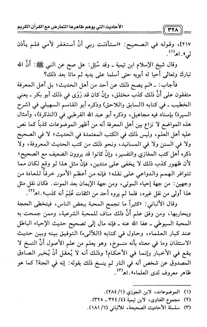 وقال شيخ الإسلام ابن تيمية ـ وقد سُئِل: هل صح عن النبي صلى الله عليه وسلم: أَنَّ الله تبارك وتعالى أحيا له أبويه حتى أسلما على يديه ثم ماتا بعد ذلك؟
