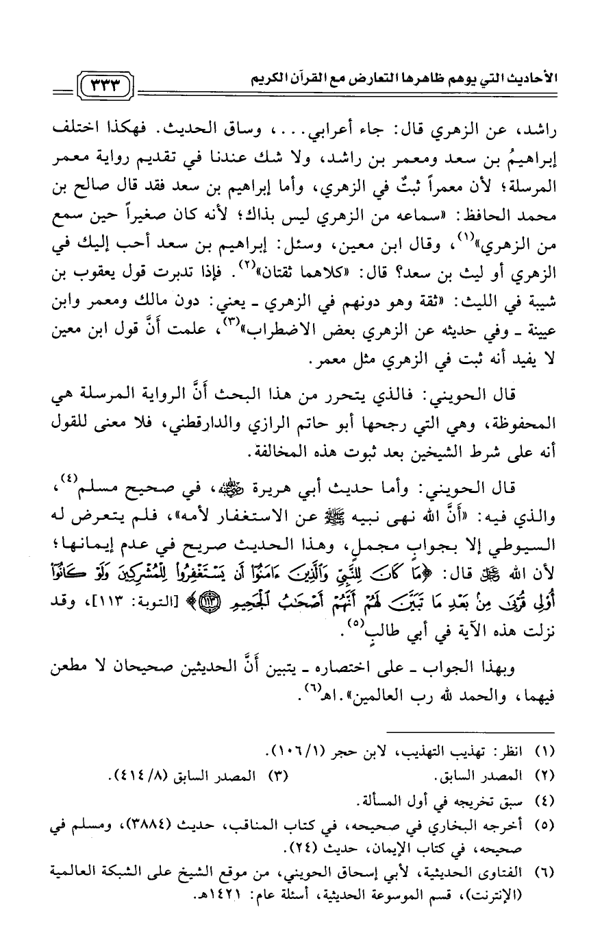 قال الحويني: وأما حديث أبي هريرة - رضي الله عنه -، في صحيح مسلم (¬4)، والذي فيه: "أَنَّ اللَّه نهى نبيه صلى الله عليه وسلم عن الاستغفار لأمه"، فلم يتعرض له السيوطي إلا بجوابٍ مجملٍ، وهذا الحديث صريح في عدم إيمانها؛ لأن اللَّه عز وجل قال: (مَا كَانَ لِلنَّبِيِّ وَالَّذِينَ آمَنُوا أَنْ يَسْتَغْفِرُوا لِلْمُشْرِكِينَ وَلَوْ كَانُوا أُولِي قُرْبَى مِنْ بَعْدِ مَا تَبَيَّنَ لَهُمْ أَنَّهُمْ أَصْحَابُ الْجَحِيمِ (113)) [التوبة: 113]، وقد نزلت هذه الآية في أبي طالبٍ. (¬5)