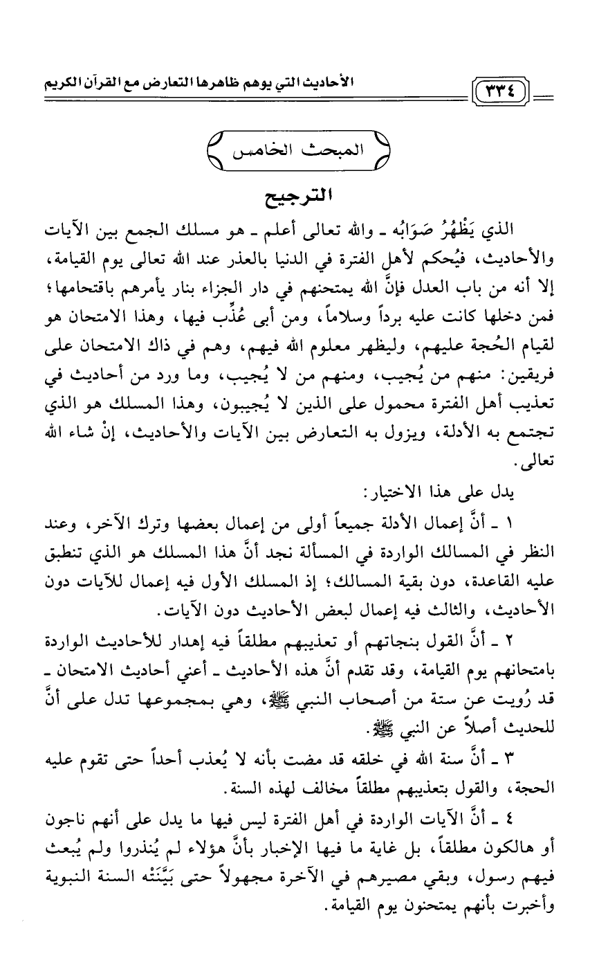 الذي يَظْهُرُ صَوَابُه ـ والله تعالى أعلم ـ هو مسلك الجمع بين الآيات والأحاديث، فيُحكم لأهل الفترة في الدنيا بالعذر عند الله تعالى يوم القيامة، إلا أنه من باب العدل فإنَّ الله يمتحنهم في دار الجزاء بنار يأمرهم باقتحامها؛ فمن دخلها كانت عليه برداً وسلاماً، ومن أبى عُذِّب فيها، وهذا الامتحان هو لقيام الحُجة عليهم، وليظهر معلوم الله فيهم، وهم في ذاك الامتحان على فريقين: منهم من يُجيب، ومنهم من لا يُجيب، وما ورد من أحاديث في تعذيب أهل الفترة محمول على الذين لا يُجيبون، وهذا المسلك هو الذي تجتمع به الأدلة، ويزول به التعارض بين الآيات والأحاديث، إنْ شاء الله تعالى.