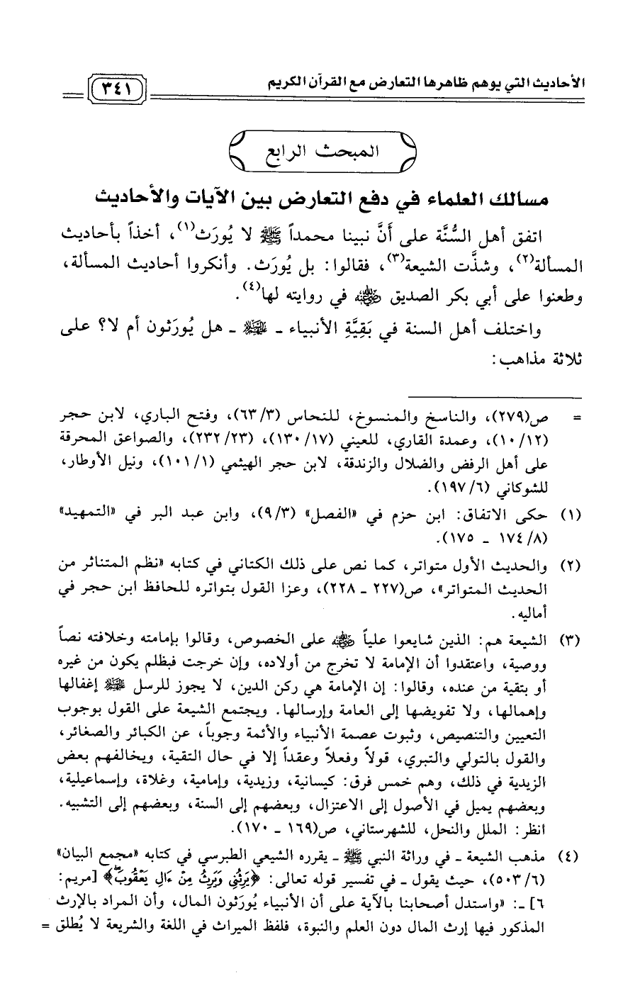 (¬4) مذهب الشيعة - في وراثة النبي - صلى الله عليه وسلم - يقرره الشيعي الطبرسي في كتابه "مجمع البيان" (6/ 503)، حيث يقول - في تفسير قوله تعالى: (يَرِثُنِي وَيَرِثُ مِنْ آلِ يَعْقُوبَ) [مريم: 6]-: "واستدل أصحابنا بالآية على أن الأنبياء يُورَثون المال، وأن المراد بالإرث المذكور فيها إرث المال دون العلم والنبوة، فلفظ الميراث في اللغة والشريعة لا يُطلق =