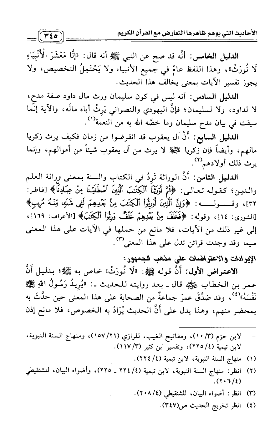 الدليل الخامس: أنَّه قد صح عن النبي - صلى الله عليه وسلم - أنه قال: "إنَّا مَعْشَرَ الْأَنْبِيَاءِ لاَ نُورَثُ"، وهذا اللفظ عامٌ في جميع الأنبياء ولا يَحْتَمِلُ التخصيص، ولا يجوز تفسير الآيات بمعنى يخالف هذا الحديث.