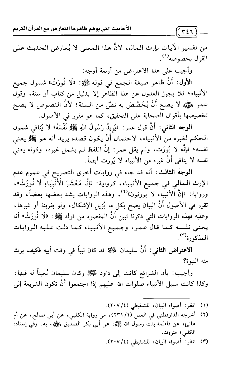الأول: أَنَّ ظاهر صيغة الجمع في قوله - صلى الله عليه وسلم -: "لاَ نُورَثُ" شمول جميع الأنبياء؛ فلا يجوز العدول عن هذا الظاهر إلا بدليل من كتاب أو سنة، وقول عمر - رضي الله عنه - لا يصح أَنْ يُخَصَّصَ به نصٌ من السنة؛ لأنَّ النصوص لا يصح تخصيصها بأقوال الصحابة على التحقيق، كما هو مقرر في الأصول.