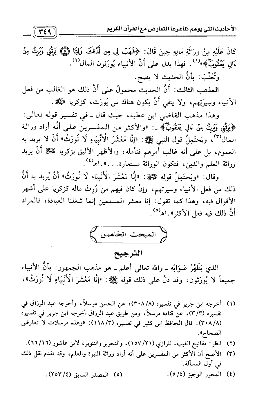 (¬3) الأصح أن الأكثر من المفسرين على أنه أراد وراثة النبوة والعلم، وقد تقدم نقل ذلك في أول المسألة.