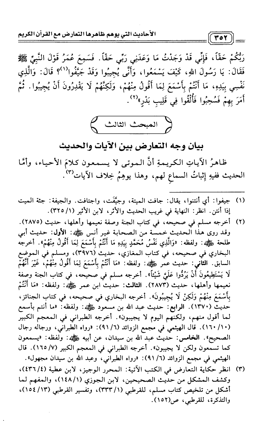 ظاهرُ الآياتِ الكريمةِ أنَّ الموتى لا يسمعون كلامَ الأحياء، وأمَّا الحديث ففيهِ إِثباتُ السماعِ لهم، وهذا يوهِمُ خِلاف الآيات. (¬3)
