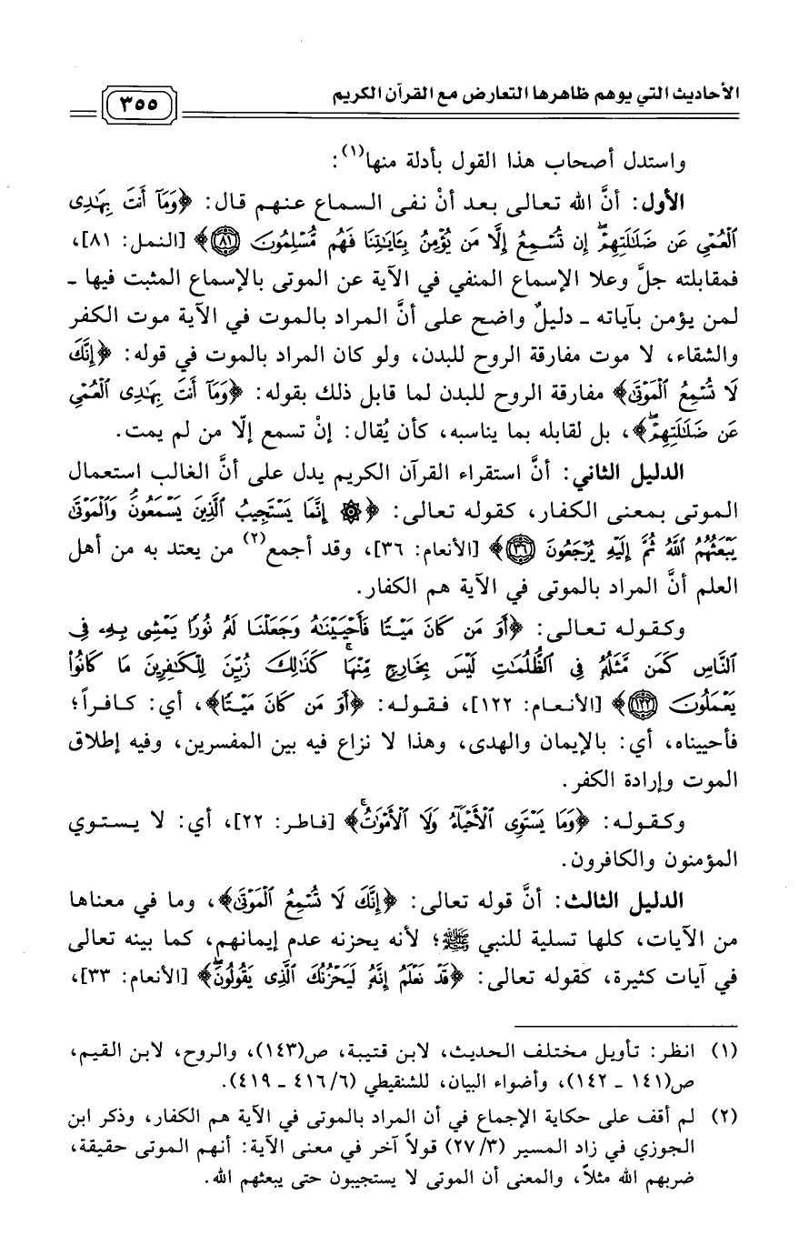 الأول: أنَّ الله تعالى بعد أنْ نفى السماع عنهم قال: (وَمَا أَنْتَ بِهَادِي الْعُمْيِ عَنْ ضَلَالَتِهِمْ إِنْ تُسْمِعُ إِلَّا مَنْ يُؤْمِنُ بِآيَاتِنَا فَهُمْ مُسْلِمُونَ (81)) [النمل: 81]، فمقابلته جلَّ وعلا الإسماع المنفي في الآية عن الموتى بالإسماع المثبت فيها - لمن يؤمن بآياته - دليلٌ واضح على أنَّ المراد بالموت في الآية موت الكفر والشقاء، لا موت مفارقة الروح للبدن، ولو كان المراد بالموت في قوله: (إِنَّكَ لَا تُسْمِعُ الْمَوْتَى) مفارقة الروح للبدن لما قابل ذلك بقوله: (وَمَا أَنْتَ بِهَادِي الْعُمْيِ عَنْ ضَلَالَتِهِمْ)، بل لقابله بما يناسبه، كأن يُقال: إنْ تسمع إلاّ من لم يمت.