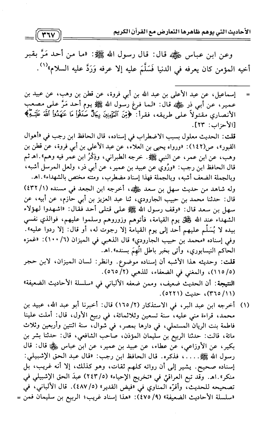 وعن ابن عباس - رضي الله عنه - قال: قال رسول الله - صلى الله عليه وسلم -: "ما من أحد مَرَّ بقبر أخيه المؤمن كان يعرفه في الدنيا فَسَلَّمَ عليه إلا عرفه وَرَدَّ عليه السلام". (¬1)