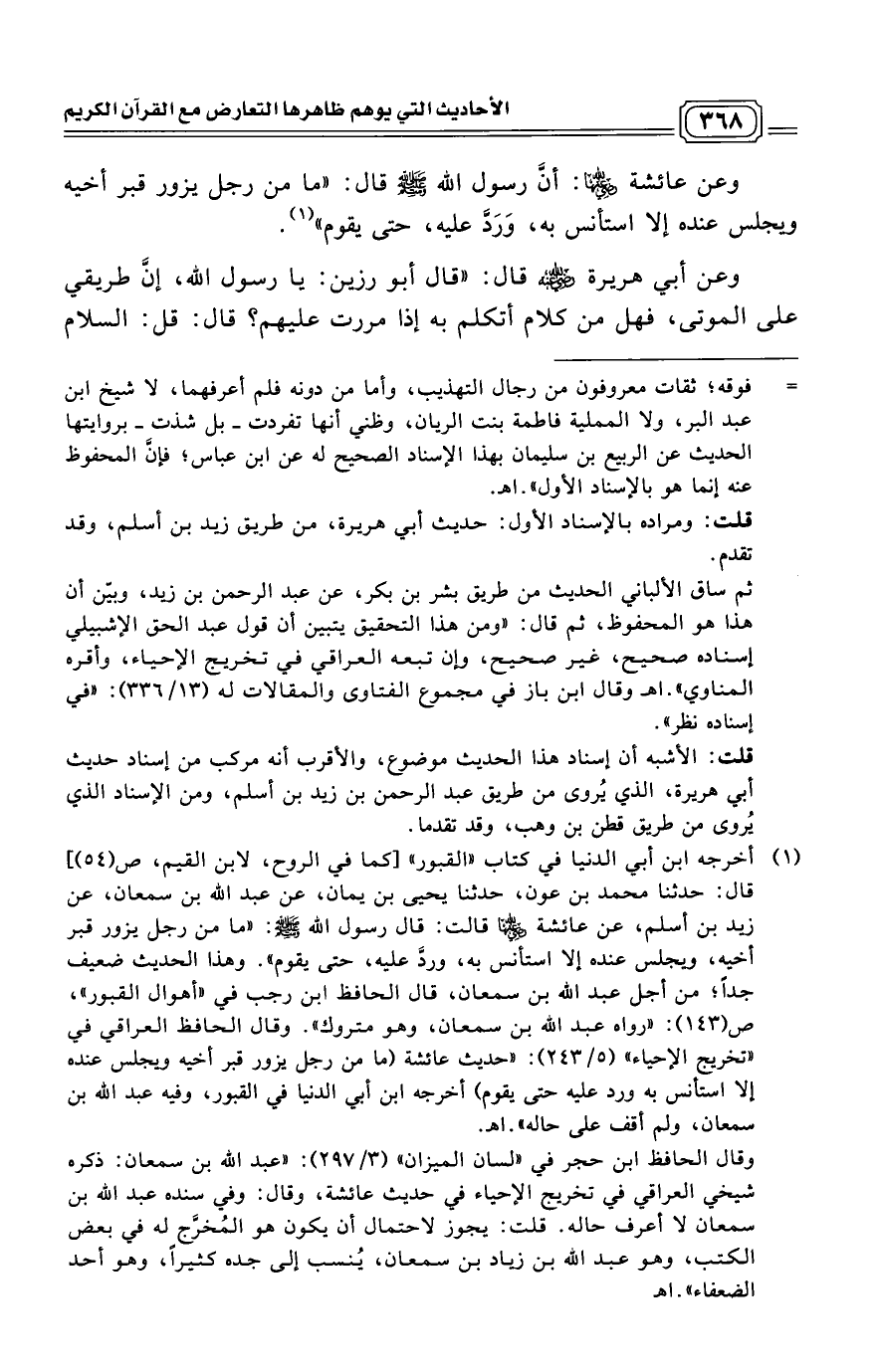 (¬1) أخرجه ابن أبي الدنيا في كتاب "القبور" [كما في الروح، لابن القيم، ص (54)] قال: حدثنا محمد بن عون، حدثنا يحيى بن يمان، عن عبد الله بن سمعان، عن زيد بن أسلم، عن عائشة رضي الله عنها قالت: قال رسول الله - صلى الله عليه وسلم -: "ما من رجل يزور قبر أخيه، ويجلس عنده إلا استأنس به، وردَّ عليه، حتى يقوم".