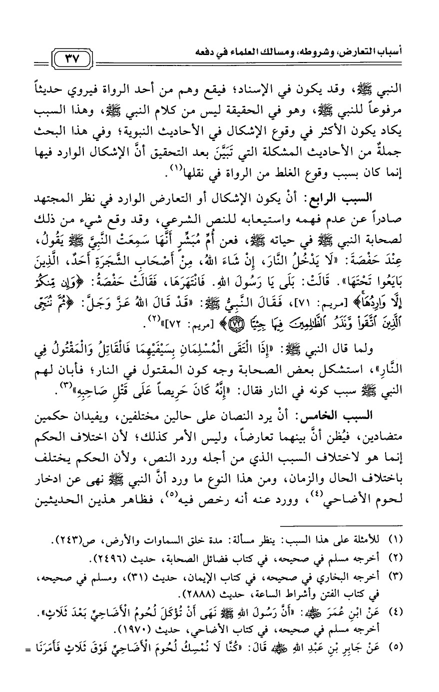 السبب الرابع: أنْ يكون الإشكال أو التعارض الوارد في نظر المجتهد صادراً عن عدم فهمه واستيعابه للنص الشرعي، وقد وقع شيء من ذلك لصحابة النبي - صلى الله عليه وسلم - في حياته - صلى الله عليه وسلم -، فعن أُمِّ مُبَشِّرٍ أَنَّهَا سَمِعَتْ النَّبِيَّ صَلَّى اللَّهُ عَلَيْهِ وَسَلَّمَ يَقُولُ، عِنْدَ حَفْصَةَ: «لَا يَدْخُلُ النَّارَ، إِنْ شَاءَ اللَّهُ، مِنْ أَصْحَابِ الشَّجَرَةِ أَحَدٌ، الَّذِينَ بَايَعُوا تَحْتَهَا». قَالَتْ: بَلَى يَا رَسُولَ اللَّهِ. فَانْتَهَرَهَا، فَقَالَتْ حَفْصَةُ: {وَإِنْ مِنْكُمْ إِلَّا وَارِدُهَا} [مريم: 71]، فَقَالَ النَّبِيُّ صَلَّى اللَّهُ عَلَيْهِ وَسَلَّمَ: «قَدْ قَالَ اللَّهُ عَزَّ وَجَلَّ: {ثُمَّ نُنَجِّي الَّذِينَ اتَّقَوْا وَنَذَرُ الظَّالِمِينَ فِيهَا جِثِيًّا (72)} [مريم: 72]». (¬2)