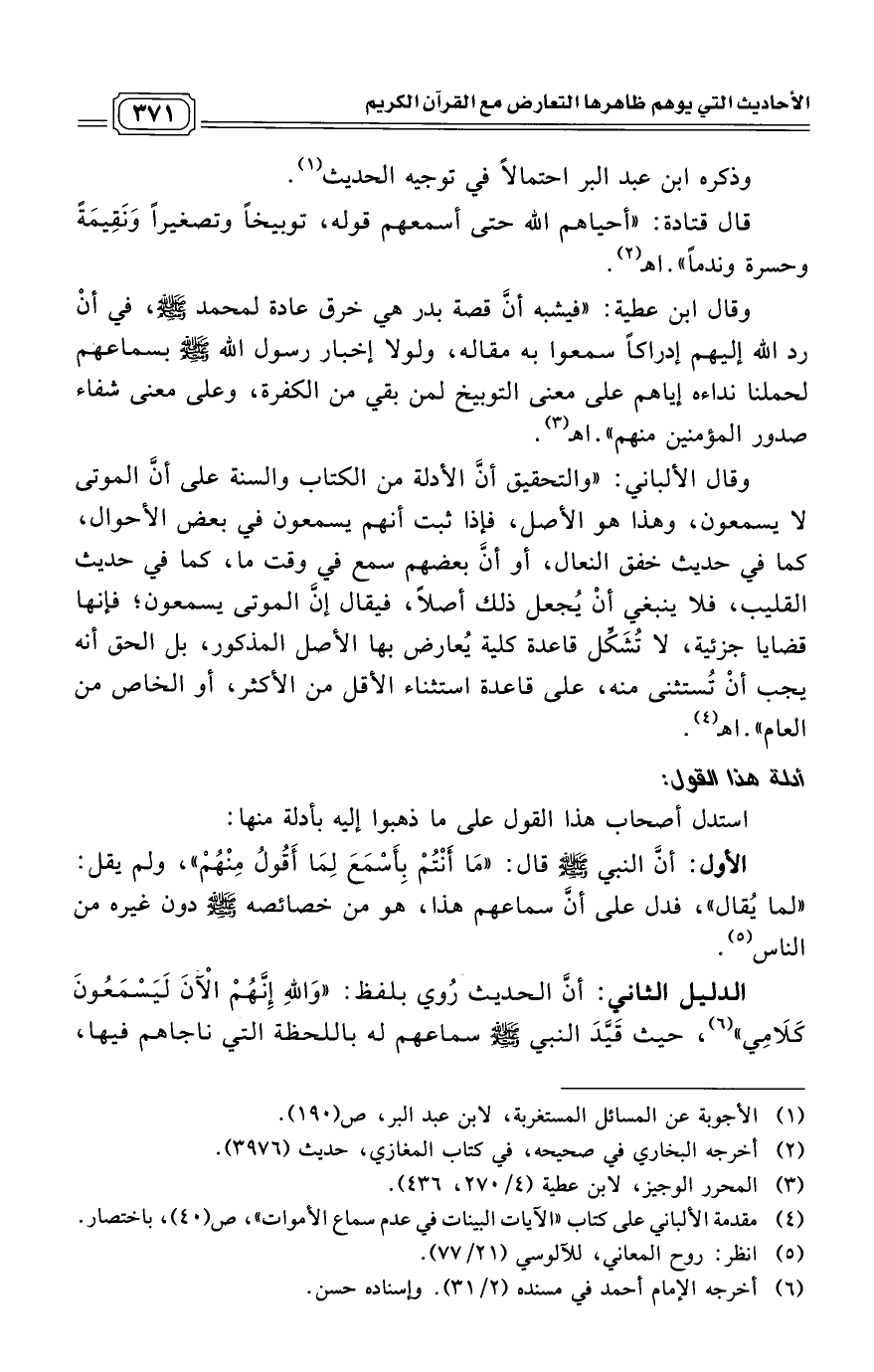 وقال الألباني: "والتحقيق أنَّ الأدلة من الكتاب والسنة على أنَّ الموتى لا يسمعون، وهذا هو الأصل، فإذا ثبت أنهم يسمعون في بعض الأحوال، كما في حديث خفق النعال، أو أنَّ بعضهم سمع في وقت ما، كما في حديث القليب، فلا ينبغي أنْ يُجعل ذلك أصلاً، فيقال إنَّ الموتى يسمعون؛ فإنها قضايا جزئية، لا تُشَكِّل قاعدة كلية يُعارض بها الأصل المذكور، بل الحق أنه يجب أنْ تُستثنى منه، على قاعدة استثناء الأقل من الأكثر، أو الخاص من العام". اهـ (¬4)