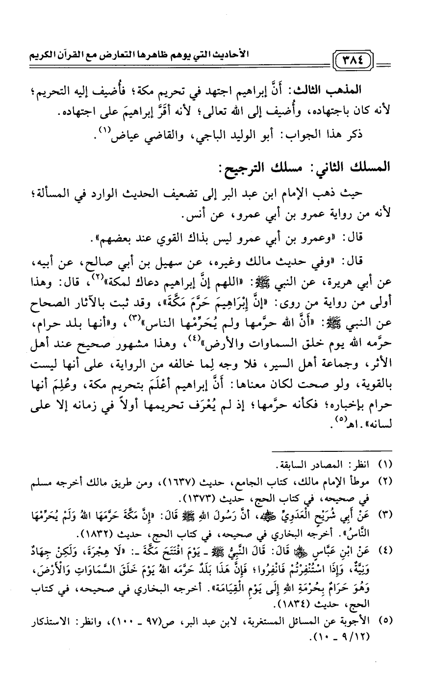 قال: "وفي حديث مالك وغيره، عن سهيل بن أبي صالح، عن أبيه، عن أبي هريرة، عن النبي - صلى الله عليه وسلم -: "اللهم إنَّ إبراهيم دعاك لمكة" (¬3)، قال: وهذا أولى من رواية من روى: "إنَّ إِبْرَاهِيمَ حَرَّمَ مَكَّةَ"، وقد ثبت بالآثار الصحاح عن النبي - صلى الله عليه وسلم -: "أَنَّ الله حرَّمها ولم يُحَرِّمْها الناس" (¬4)، و "أنها بلد حرام، حرَّمه الله يوم خلق السماوات والأرض" (¬5)، وهذا مشهور صحيح عند أهل الأثر، وجماعة أهل السير، فلا وجه لِما خالفه من الرواية، على أنها ليست بالقوية، ولو صحت لكان معناها: أَنَّ إبراهيم أعْلَمَ بتحريم مكة، وعُلِمَ أنها حرام بإخباره؛ فكأنه حرَّمها؛ إذ لم يُعْرَف تحريمها أولاً في زمانه إلا على لسانه". اهـ (¬6)
