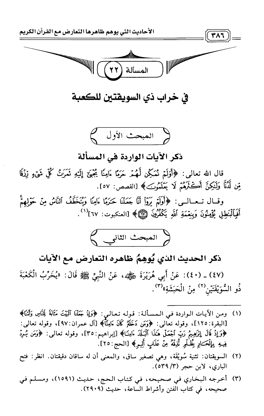 (47) ـ (40): عَنْ أَبِي هُرَيْرَةَ رَضِيَ اللَّهُ عَنْهُ، عَنْ النَّبِيِّ صَلَّى اللَّهُ عَلَيْهِ وَسَلَّمَ قَالَ: "يُخَرِّبُ الْكَعْبَةَ ذُو السُّوَيْقَتَيْنِ (¬2) مِنْ الْحَبَشَةِ". (¬3)