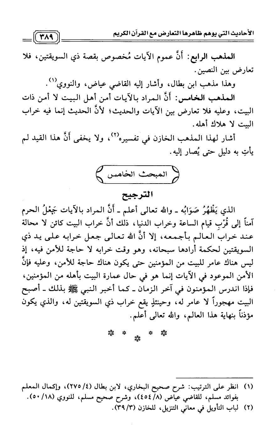 المذهب الخامس: أَنَّ المراد بالآيات أمن أهل البيت لا أمن ذات البيت، وعليه فلا تعارض بين الآيات والحديث؛ لأنَّ الحديث إنما فيه خراب البيت لا هلاك أهله.