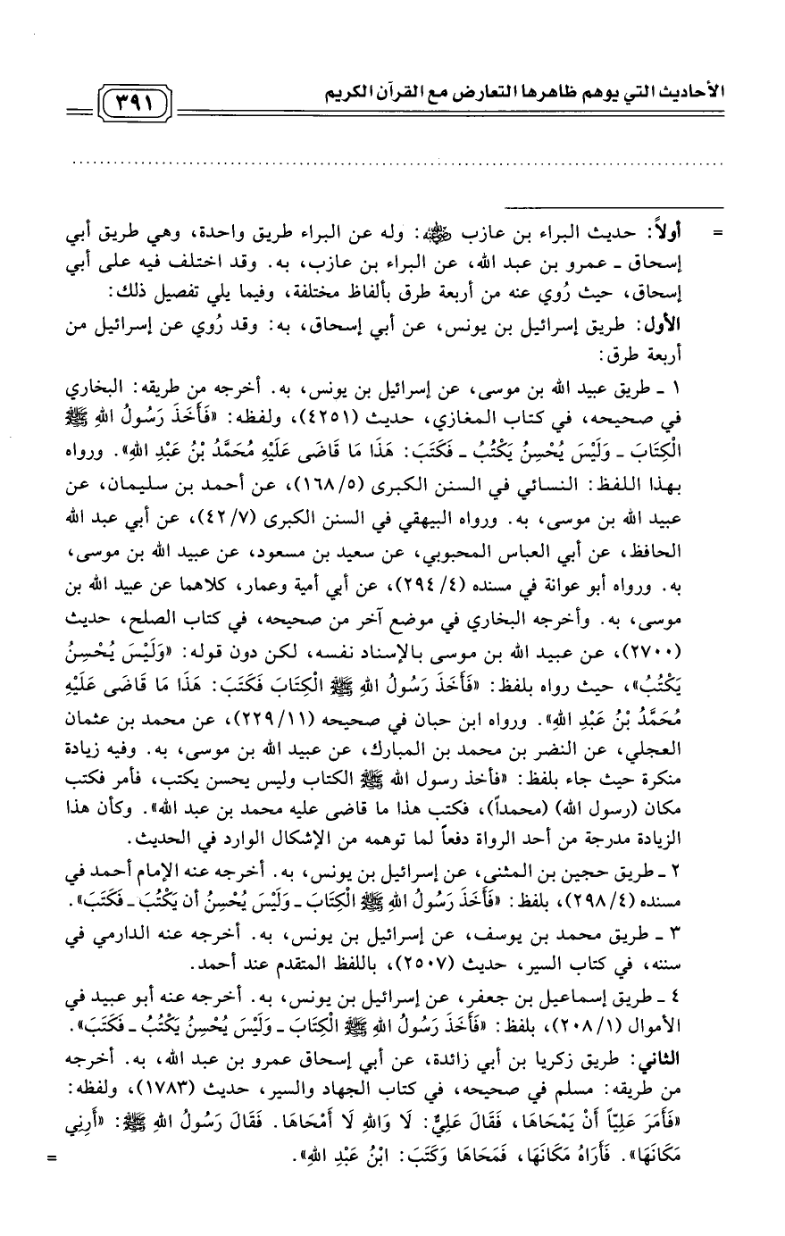 ورواه ابن حبان في صحيحه (11/ 229)، عن محمد بن عثمان العجلي، عن النضر بن محمد بن المبارك، عن عبيد الله بن موسى، به. وفيه زيادة منكرة حيث جاء بلفظ: "فأخذ رسول الله - صلى الله عليه وسلم - الكتاب وليس يحسن يكتب، فأمر فكتب مكان (رسول الله) (محمداً)، فكتب هذا ما قاضى عليه محمد بن عبدالله".
