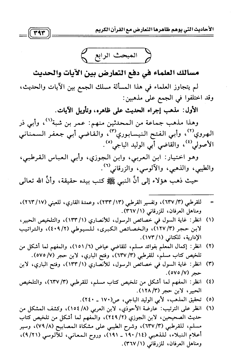 المبحث الرابع: مسالك العلماء في دفع التعارض بين الآيات والحديث:
