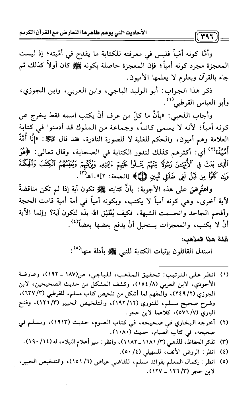 وأجاب الذهبي: "بأنَّ ما كلّ من عرف أنْ يكتب اسمه فقط يخرج عن كونه أمياً؛ لأنه لا يسمى كاتباً، وجماعة من الملوك قد أدمنوا في كتابة العلامة وهم أميون، والحكم للغلبة لا للصورة النادرة، فقد قال عليه السلام: "إِنَّا أُمَّةٌ أُمِّيَّةٌ" (¬2) أي أكثرهم كذلك لندور الكتابة في الصحابة، وقال تعالى: (هُوَ الَّذِي بَعَثَ فِي الْأُمِّيِّينَ رَسُولًا مِنْهُمْ يَتْلُو عَلَيْهِمْ آيَاتِهِ وَيُزَكِّيهِمْ وَيُعَلِّمُهُمُ الْكِتَابَ وَالْحِكْمَةَ وَإِنْ كَانُوا مِنْ قَبْلُ لَفِي ضَلَالٍ مُبِينٍ (2)) [الجمعة: 2] ". اهـ (¬3)