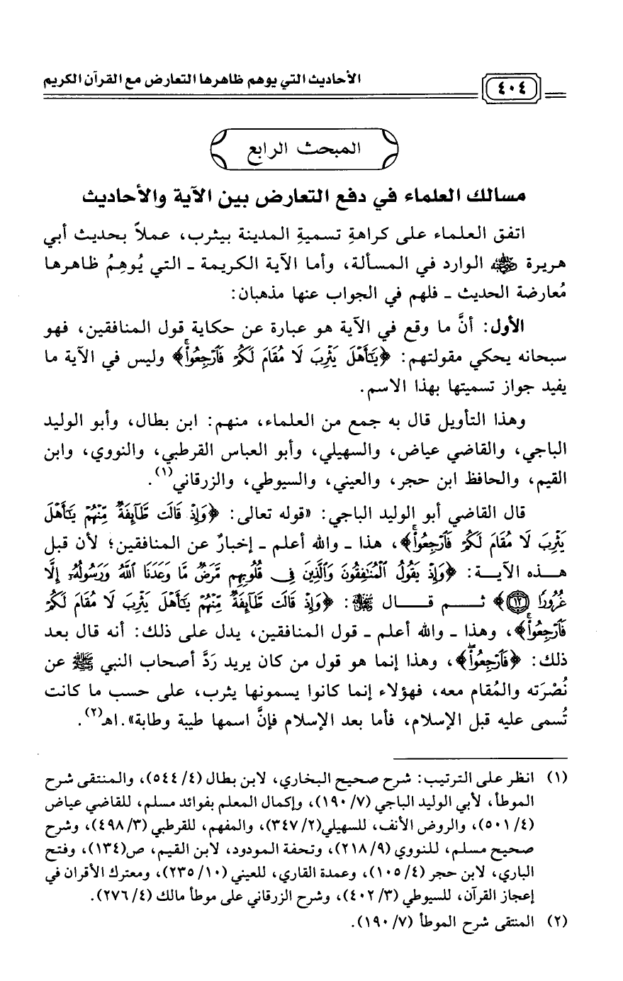 قال القاضي أبو الوليد الباجي: "قوله تعالى: (وَإِذْ قَالَتْ طَائِفَةٌ مِنْهُمْ يَا أَهْلَ يَثْرِبَ لَا مُقَامَ لَكُمْ فَارْجِعُوا)، هذا ـ والله أعلم ـ إخبارٌ عن المنافقين; لأن قبل هذه الآية: (وَإِذْ يَقُولُ الْمُنَافِقُونَ وَالَّذِينَ فِي قُلُوبِهِمْ مَرَضٌ مَا وَعَدَنَا اللَّهُ وَرَسُولُهُ إِلَّا غُرُورًا (12)) ثم قال سبحانه وتعالى: (وَإِذْ قَالَتْ طَائِفَةٌ مِنْهُمْ يَا أَهْلَ يَثْرِبَ لَا مُقَامَ لَكُمْ فَارْجِعُوا)، وهذا ـ والله أعلم ـ قول المنافقين، يدل على ذلك: أنه قال بعد ذلك: (فَارْجِعُوا)، وهذا إنما هو قول من كان يريد رَدَّ أصحاب النبي صلى الله عليه وسلم عن نُصْرَته والمُقام معه، فهؤلاء إنما كانوا يسمونها يثرب، على حسب ما كانت تُسمى عليه قبل الإسلام، فأما بعد الإسلام فإنَّ اسمها طيبة وطابة". اهـ (¬2)