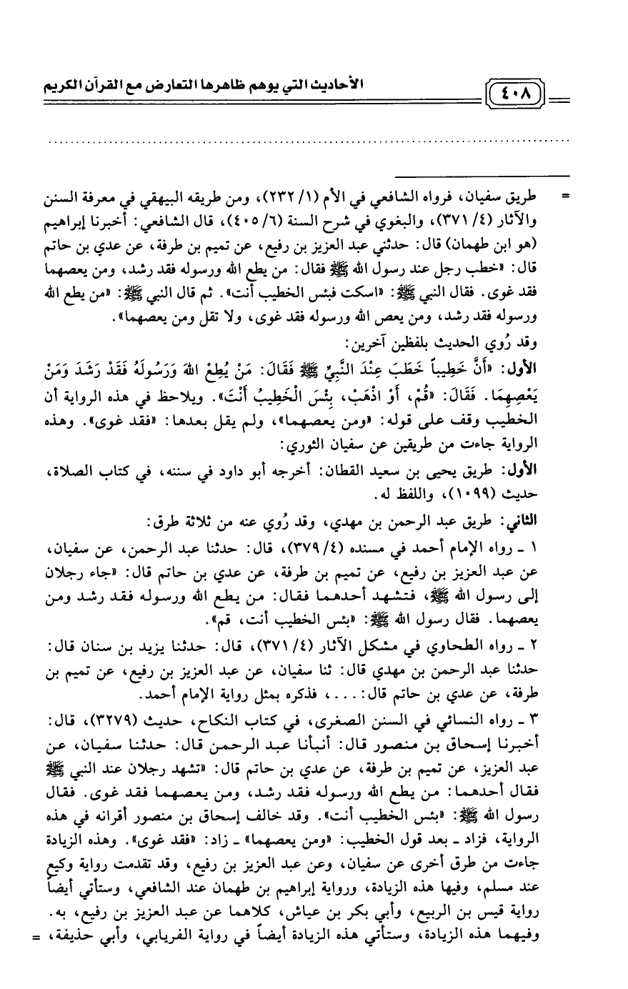 = طريق سفيان، فرواه الشافعي في الأم (1/ 232)، ومن طريقه البيهقي في معرفة السنن والآثار (4/ 371)، والبغوي في شرح السنة (6/ 405)، قال الشافعي: أخبرنا إبراهيم (هو ابن طهمان) قال: حدثني عبد العزيز بن رفيع، عن تميم بن طرفة، عن عدي بن حاتم قال: "خطب رجل عند رسول الله صلى الله عليه وسلم فقال: من يطع الله ورسوله فقد رشد، ومن يعصهما فقد غوى. فقال النبي صلى الله عليه وسلم: اسكت فبئس الخطيب أنت". ثم قال النبي صلى الله عليه وسلم: "من يطع الله ورسوله فقد رشد، ومن يعص الله ورسوله فقد غوى، ولا تقل ومن يعصهما".