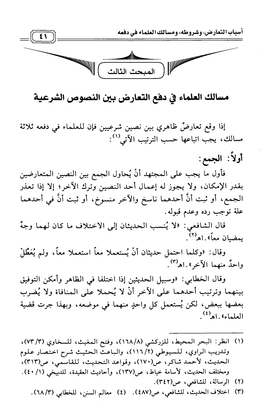 إذا وقع تعارضٌ ظاهري بين نصين شرعيين فإن للعلماء في دفعه ثلاثة مسالك، يجب اتباعها حسب الترتيب الآتي (¬1):