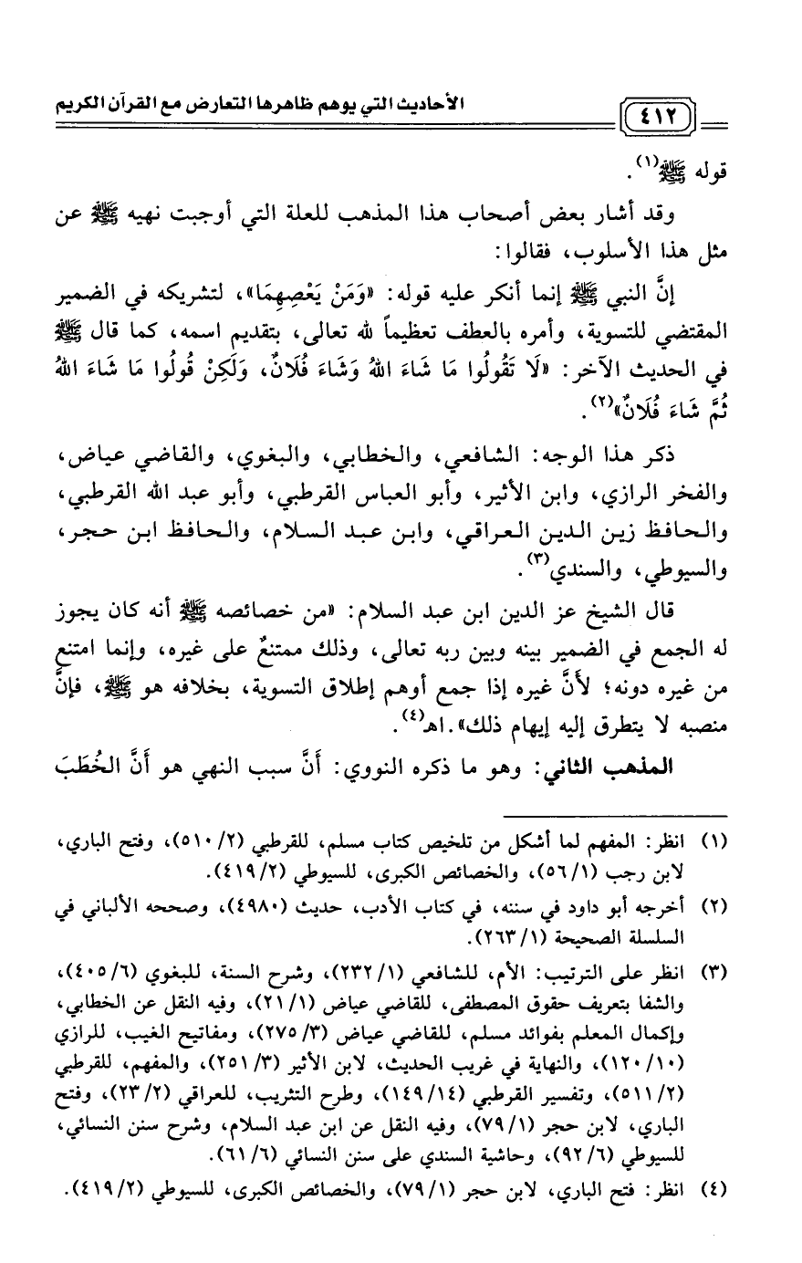 (¬3) انظر على الترتيب: الأم، للشافعي (1/ 232)، وشرح السنة، للبغوي (6/ 405)، والشفا بتعريف حقوق المصطفى، للقاضي عياض (1/ 21)، وفيه النقل عن الخطابي، وإكمال المعلم بفوائد مسلم، للقاضي عياض (3/ 275)، ومفاتيح الغيب، للرازي (10/ 120)، والنهاية في غريب الحديث، لابن الأثير (3/ 251)، والمفهم، للقرطبي (2/ 511)، وتفسير القرطبي (14/ 149)، وطرح التثريب، للعراقي (2/ 23)، وفتح الباري، لابن حجر (1/ 79)، وفيه النقل عن ابن عبد السلام، وشرح سنن النسائي، للسيوطي (6/ 92)، وحاشية السندي على سنن النسائي (6/ 61).