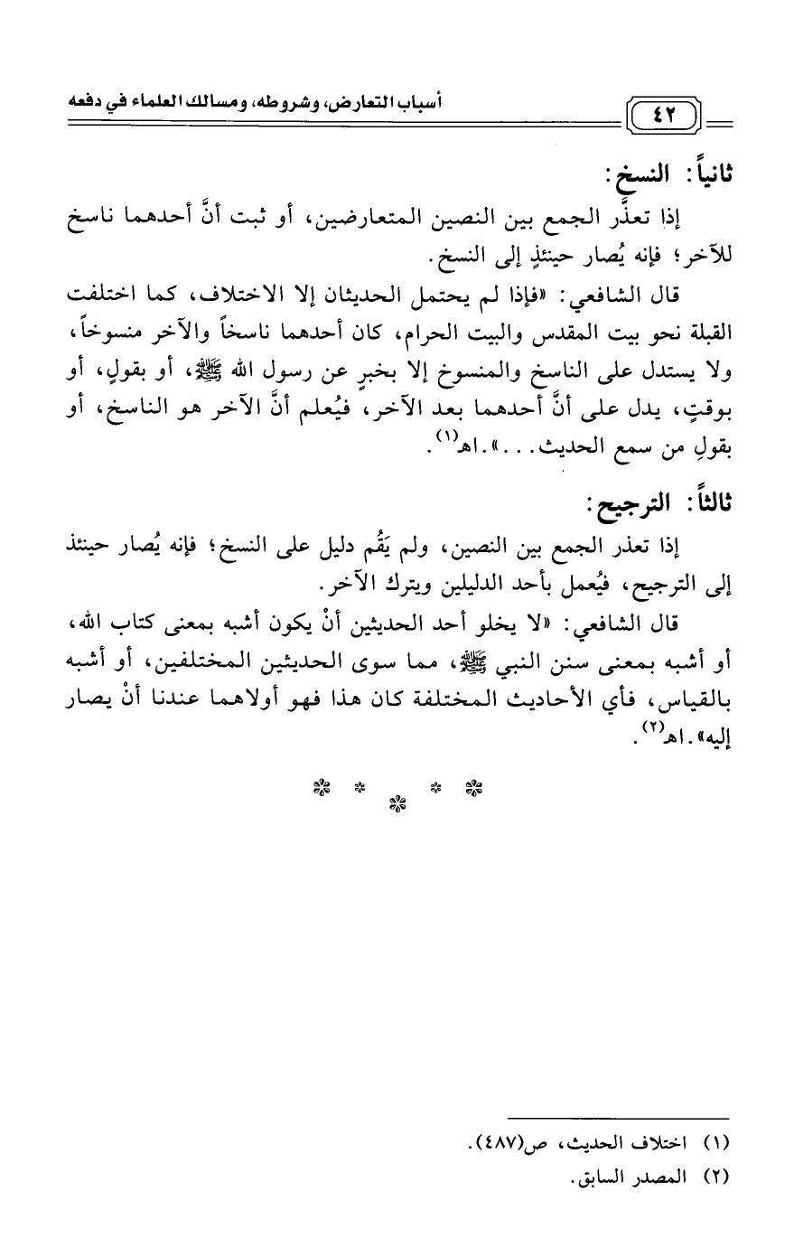 قال الشافعي: «لا يخلو أحد الحديثين أنْ يكون أشبه بمعنى كتاب الله، أو أشبه بمعنى سنن النبي - صلى الله عليه وسلم -، مما سوى الحديثين المختلفين، أو أشبه بالقياس، فأي الأحاديث المختلفة كان هذا فهو أولاهما عندنا أنْ يصار إليه». اهـ (¬2)