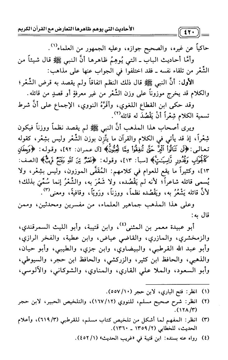 ويرى أصحاب هذا المذهب أنَّ النبي - صلى الله عليه وسلم - لم يقصد نظماً ووزناً فيكون شِعْراً، إذ قد يأتي في الكلام والقرآن ما يتَّزِن بوزن الشِّعْر وليس بشِعْر، كقوله تعالى: (لَنْ تَنَالُوا الْبِرَّ حَتَّى تُنْفِقُوا مِمَّا تُحِبُّونَ) [آل عمران: 92]، وقوله: (وَجِفَانٍ كَالْجَوَابِ وَقُدُورٍ رَاسِيَاتٍ) [سبأ: 13]، وقوله: (نَصْرٌ مِنَ اللَّهِ وَفَتْحٌ قَرِيبٌ) [الصف: 13]، وكثيراً ما يقع للعوام في كلامهم: المُقَفَّى الموزون، وليس بشِعْر، ولا يُسمى قائله شاعراً؛ لأنه لم يَقْصُده، ولا شَعُرَ به، والشِّعْرُ إنما سُمِّيَ بذلك؛ لأنَّ قائله يَشْعُرُ به، ويَقْصُده نظماً، ووزناً، ورَويّاً، وقافيةً، ومعنى. (¬4)