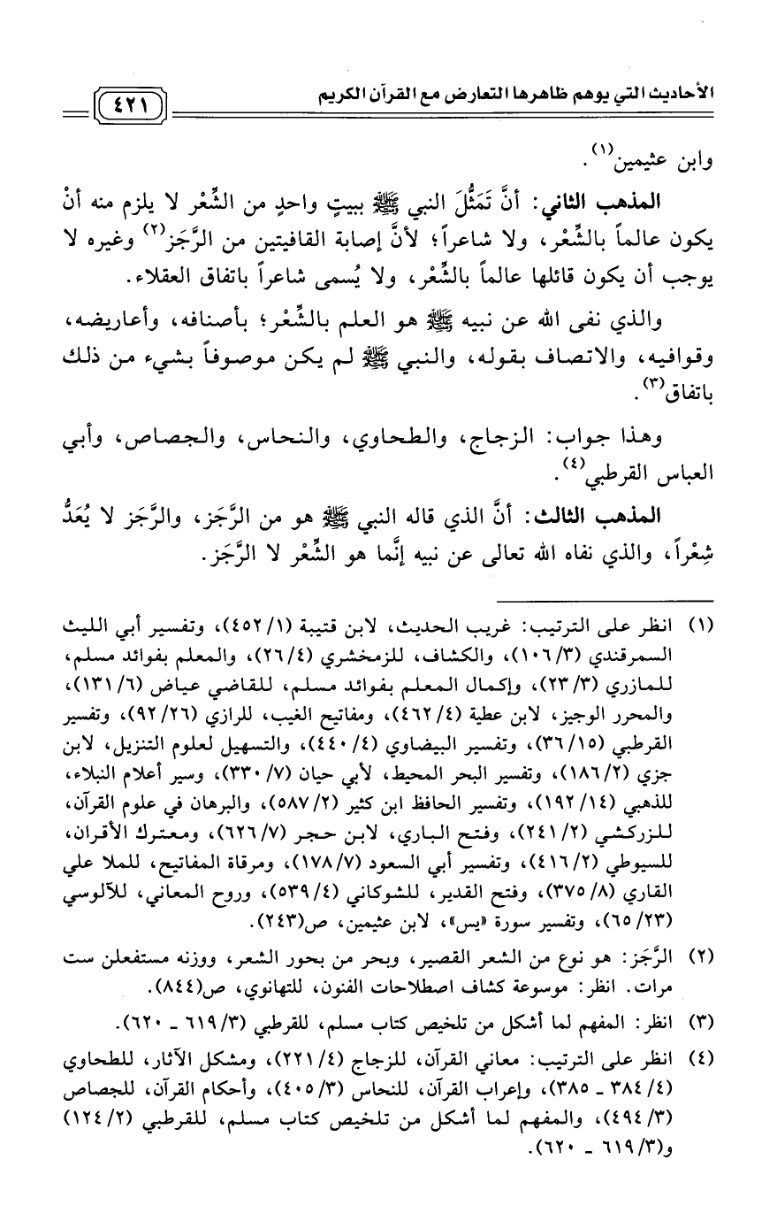 المذهب الثالث: أنَّ الذي قاله النبي - صلى الله عليه وسلم - هو من الرَّجَز، والرَّجَز لا يُعَدُّ شِعْراً، والذي نفاه الله تعالى عن نبيه إنَّما هو الشِّعْر لا الرَّجَز.