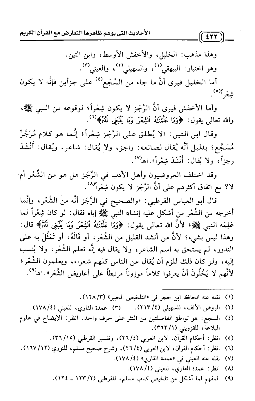 قال أبو العباس القرطبي: "والصحيح في الرَّجَز أنَّه من الشِّعْر، وإنَّما أخرجه من الشِّعْر من أشكل عليه إنشاد النبي - صلى الله عليه وسلم - إياه فقال: لو كان شِعْراً لما عَلِمَه النبي - صلى الله عليه وسلم -؛ لأنَّ الله تعالى يقول: (وَمَا عَلَّمْنَاهُ الشِّعْرَ وَمَا يَنْبَغِي لَهُ) قال: وهذا ليس بشيء؛ لأنَّ من أنشد القليل من الشِّعْر، أو قَالَهُ، أو تَمَثَّلَ به على الندور، لم يستحق به اسم الشاعر، ولا يقال فيه إنَّه تعلم الشِّعْر، ولا يُنسب إليه، ولو كان ذلك للزم أن يُقال عن الناس كلهم شعراء، ويعلمون الشِّعْر؛ لأنَّهم لا يَخْلُونَ أنْ يعرفوا كلاماً موزوناً مرتبطاً على أعاريض الشِّعْر". اهـ (¬11)