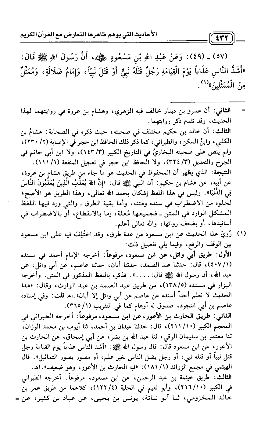 (57) ـ (49): وَعَنْ عَبْدِ اللَّهِ بْنِ مَسْعُودٍ - رضي الله عنه -، أَنَّ رَسُولَ اللَّهِ صَلَّى اللَّهُ عَلَيْهِ وَسَلَّمَ قَالَ: "أَشَدُّ النَّاسِ عَذَابًا يَوْمَ الْقِيَامَةِ رَجُلٌ قَتَلَهُ نَبِيٌّ أَوْ قَتَلَ نَبِيًّا، وَإِمَامُ ضَلَالَةٍ، وَمُمَثِّلٌ مِنْ الْمُمَثِّلِينَ". (¬1)