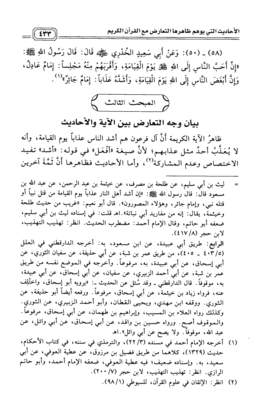 = ليث بن أبي سليم، عن طلحة بن مصرف، عن خيثمة بن عبد الرحمن، عن عبد الله بن مسعود قال: قال رسول الله صلى الله عليه وسلم: "إن أشد أهل النار عذاباً يوم القيامة من قتل نبياً أو قتله نبي، وإمام جائر، وهؤلاء المصورون".