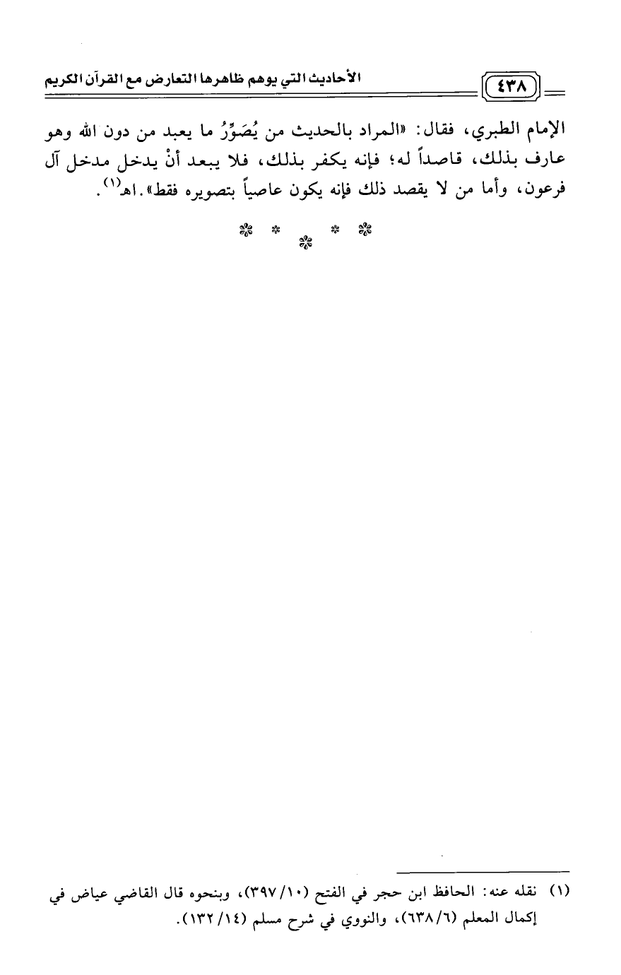 الإمام الطبري، فقال: "المراد بالحديث من يُصَوِّرُ ما يعبد من دون الله وهو عارف بذلك، قاصداً له؛ فإنه يكفر بذلك، فلا يبعد أنْ يدخل مدخل آل فرعون، وأما من لا يقصد ذلك فإنه يكون عاصياً بتصويره فقط". اهـ (¬1)